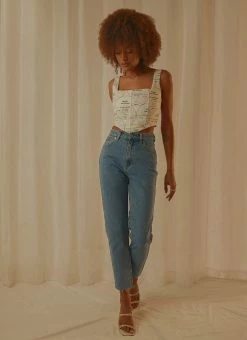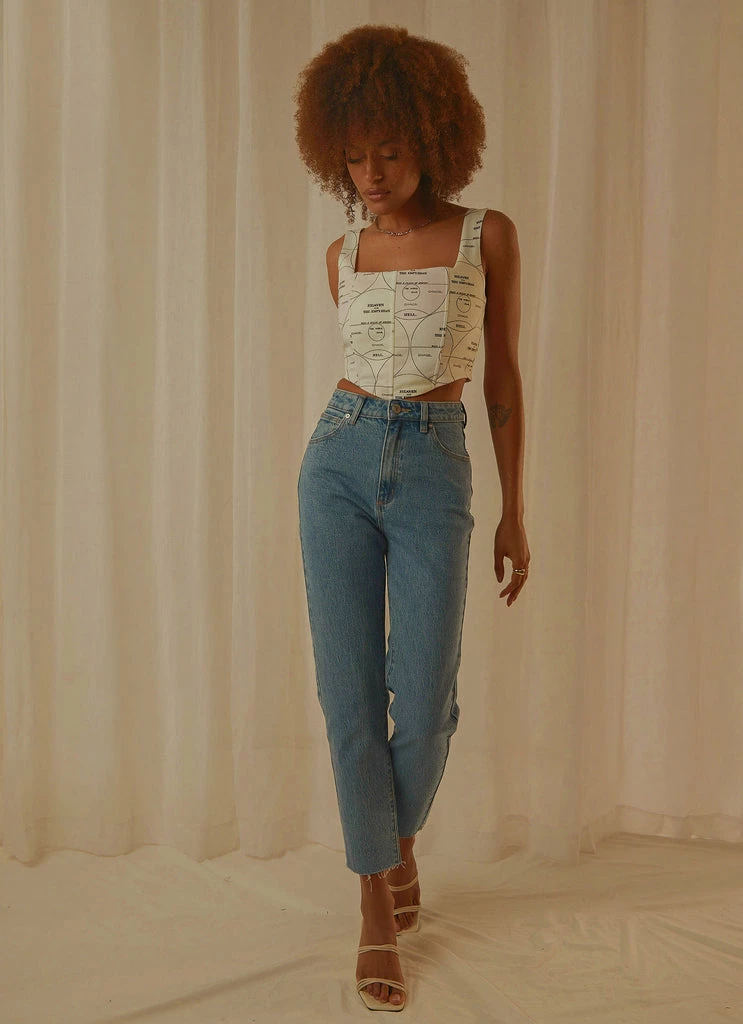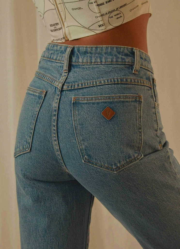 The 94 High Slim Jeans by Abrand is a slim fitting jeans and is designed with a cropped raw hemmed ankle, rip on the upper left thigh, belt loops, five pockets, zip fly and button closure and the iconic tan brand patch on the reverse. Make it a look by adding a slim fitting singlet with an oversized blazer.