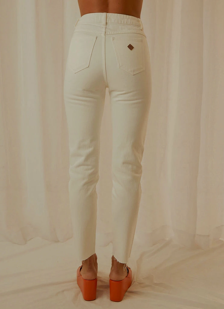 The A 94 High slim in White Fade is a high rise, slim leg jean, made with a rigid denim. We suggest going up a size.