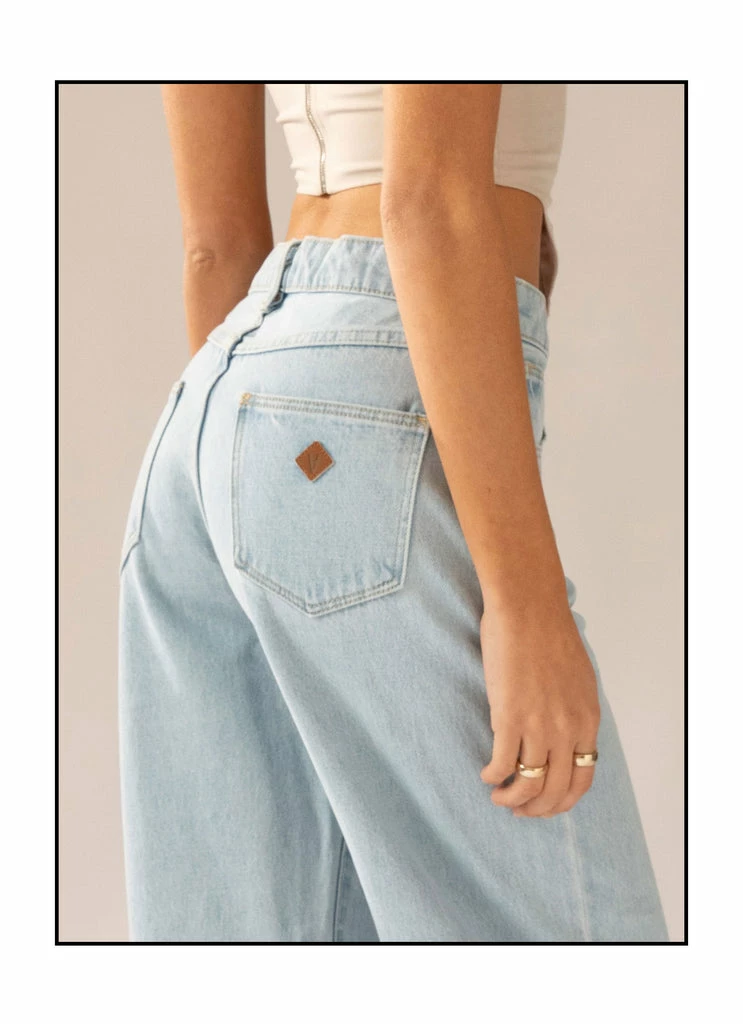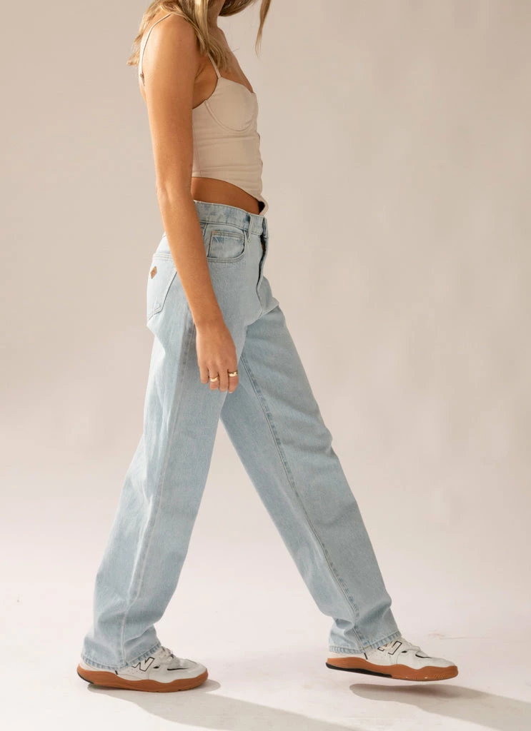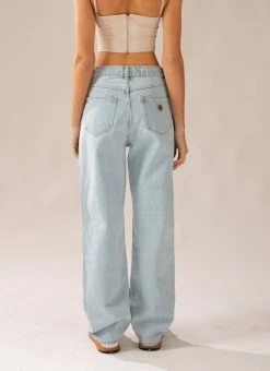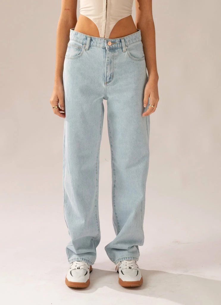The A Slouch Jeans by Abrand are a baggy fit, mid rise jean. This style is a light blue bleached colour way with rips on the knees and upper leg. Featuring five-pocket styling, branded hardware, zip fly with button closure and signature Abrand patch at reverse.