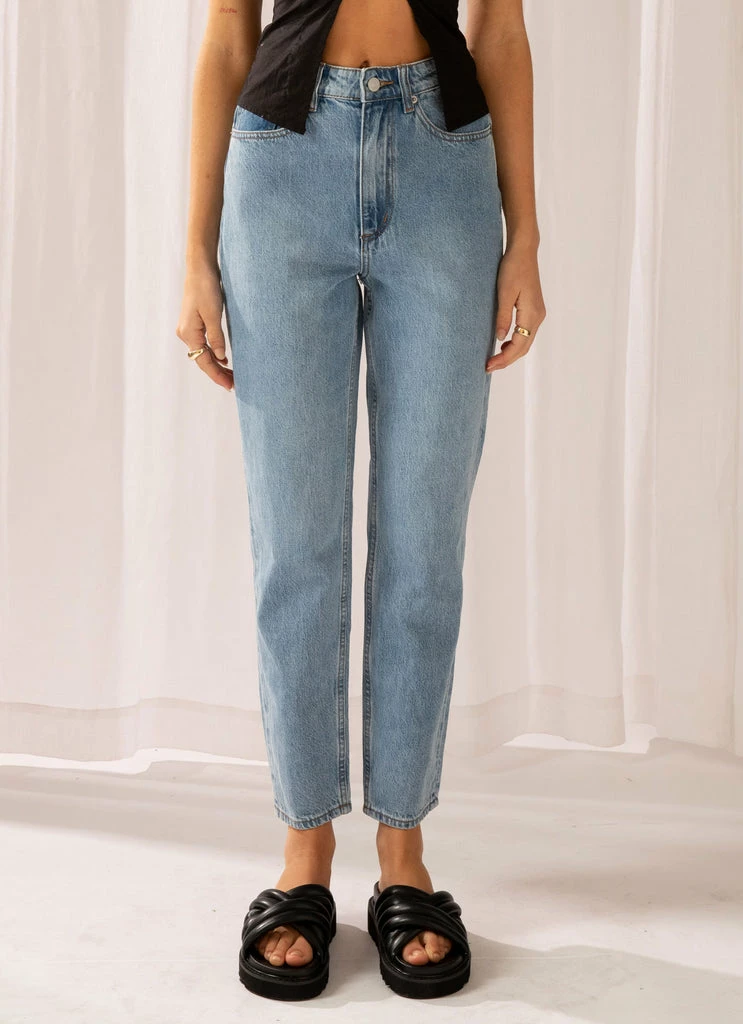Our coveted High Moms sit super high on the waist, with a slim leg that tapers to the hem, finishing at a slightly cropped, ankle skimming length. Designed to be worn fitted, this jean will soften and shape to the body with wear. A beautiful vintage inspired wash, on our new Eco-Air HEMP blend denim.