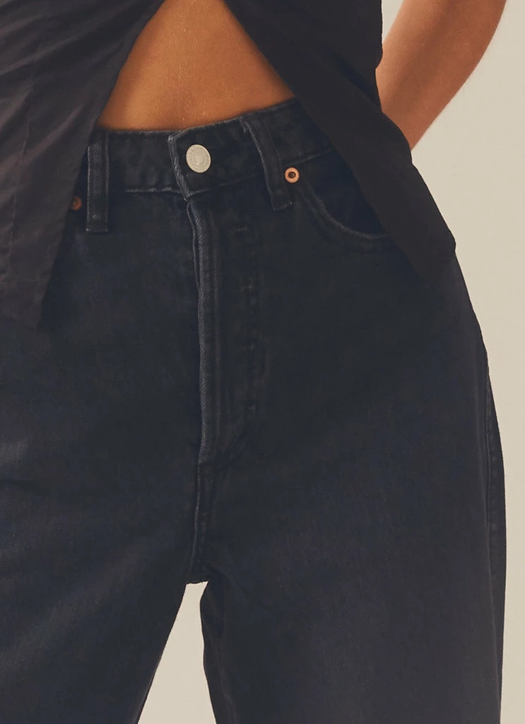 Made to look like a rigid vintage denim, but feel like your favourite jeans. The High Relaxed Jean features a super high rise and a relaxed tapered leg. Crafted in a soft, washed black Eco-Air organic cotton comfort rigid denim. We love them paired back with a cropped graphic tee and gold jewellery.