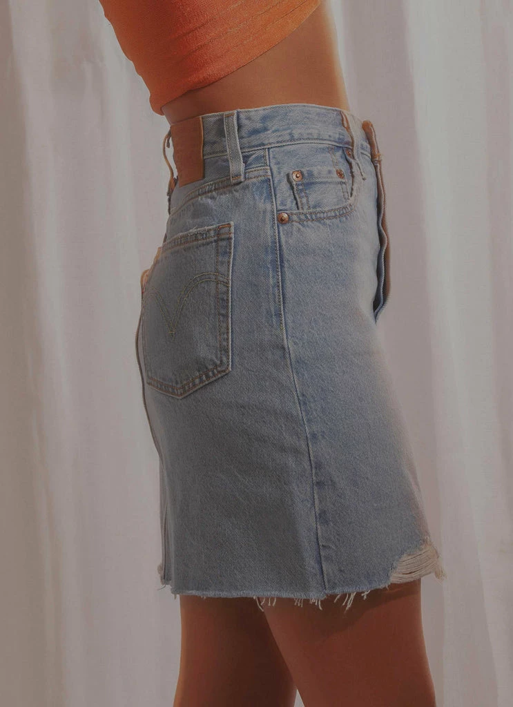 A classic denim mini skirt with a flattering high rise. This versatile silhouette pairs well with pretty much anything. Features a cut-off hem.
