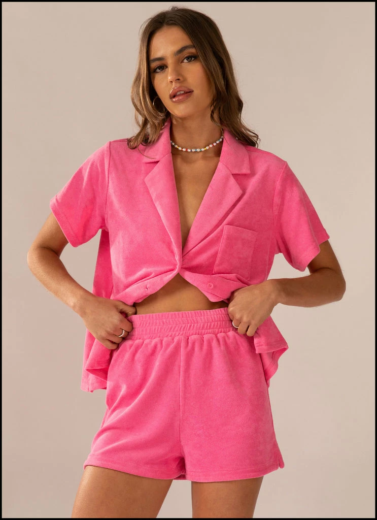 Slay all summer in the Castaway Terry Shorts. Designed to be worn higher on the hips, this jogger style of short is crafted in our eye catching perry pink terry towelling.