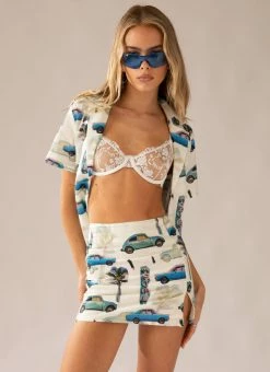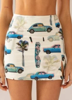 The perfect summer party print! A cute ?lil linen mini skirt crafted in a crisp white linen with a vintage inspired retro print. This is a fitted, mid rise style with invisible zipper closure.