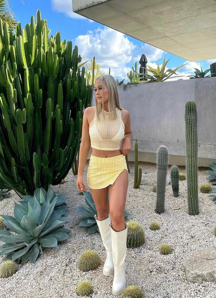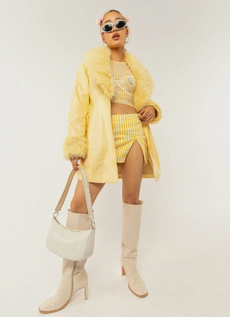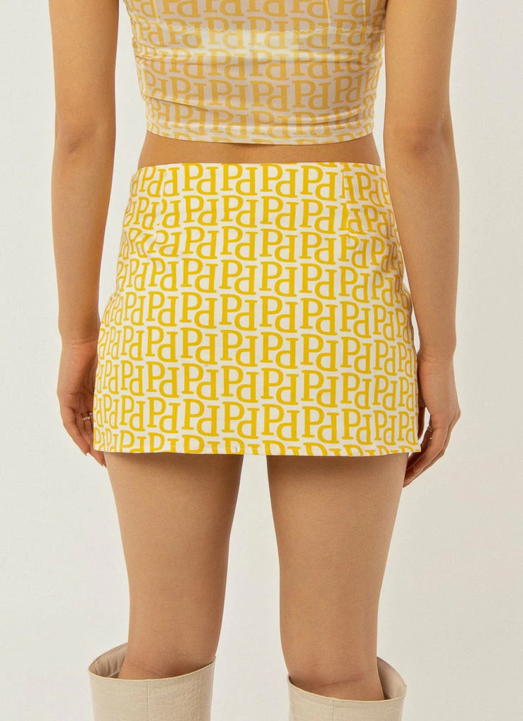 The perfect combination of sexy and cute! Designed to be worn lower on the hips and features a split on the left thigh and our exclusive print in an eye-catching yellow. Complete the co-ord look and pair it back with the Your Only One Bustier Top, layered with the Patience Mesh Crop.