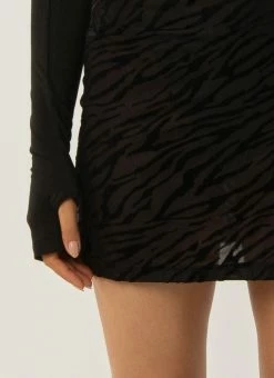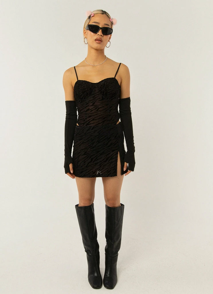 Made for music in the sun with the gals. The Lift Me Up Mini Skirt is a low rise mini skirt crafted in sheer mesh with a sexy velvet zebra print. Perfectly paired with all crop or styled back with the Put Me First Bodysuit.