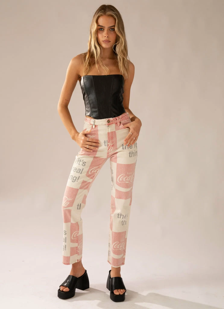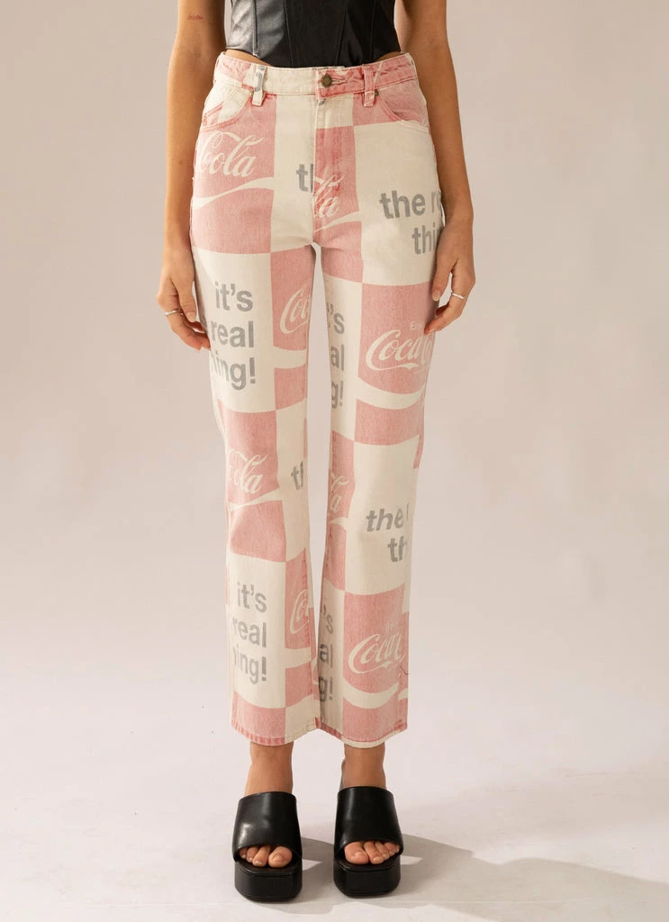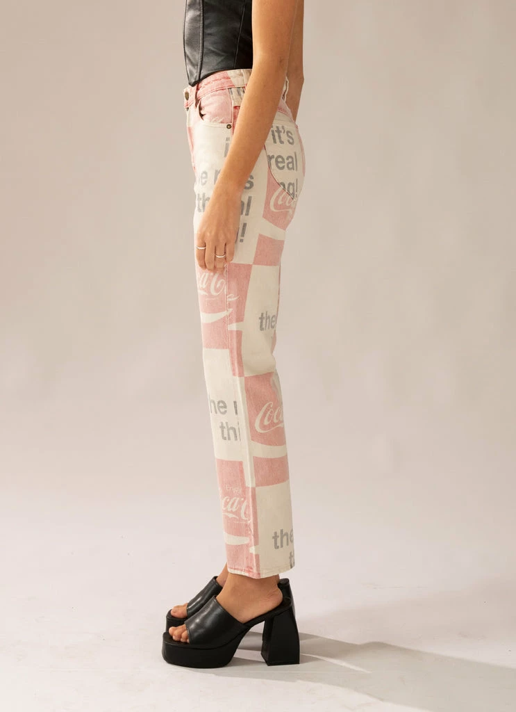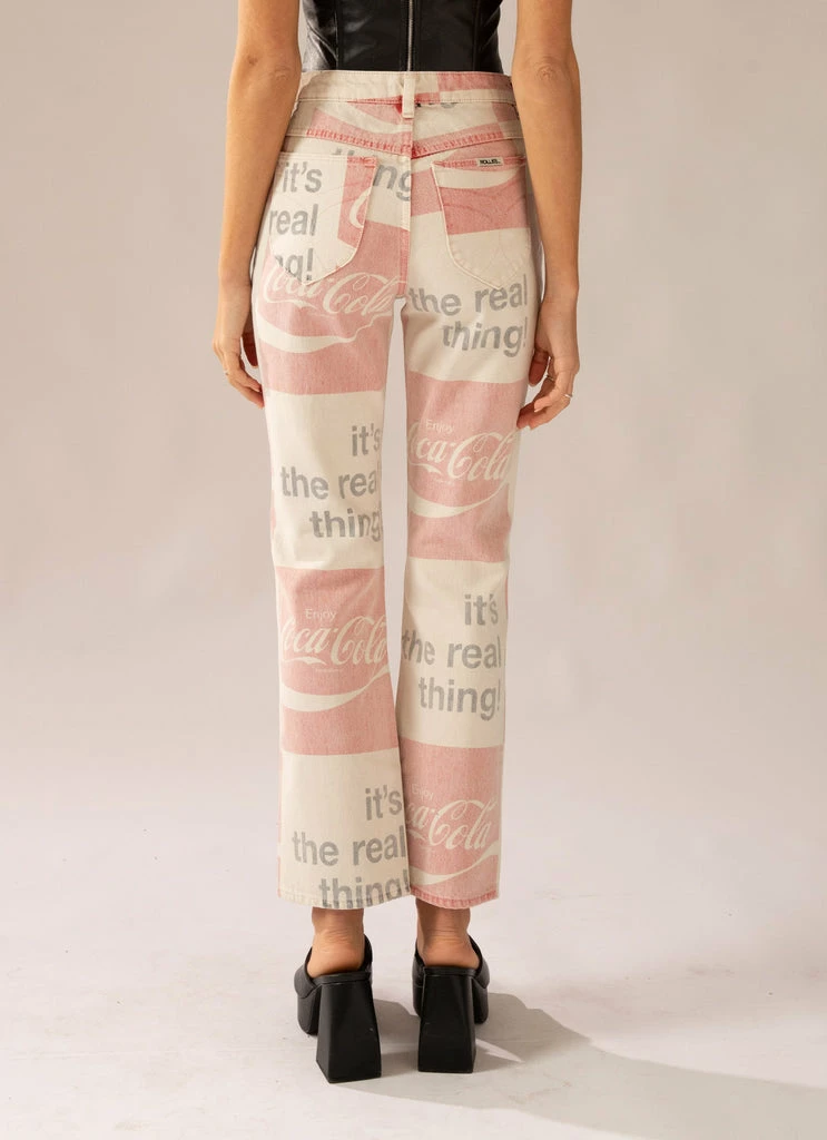 All the retro vibes! The Original Straight Jeans by Rolla’s come in an original Coca Cola printed white denim and are designed with a high-rise, straight leg fit. The jeans feature five-pocket styling, belt loops, zip fly with button closure and are slightly cropped in length.