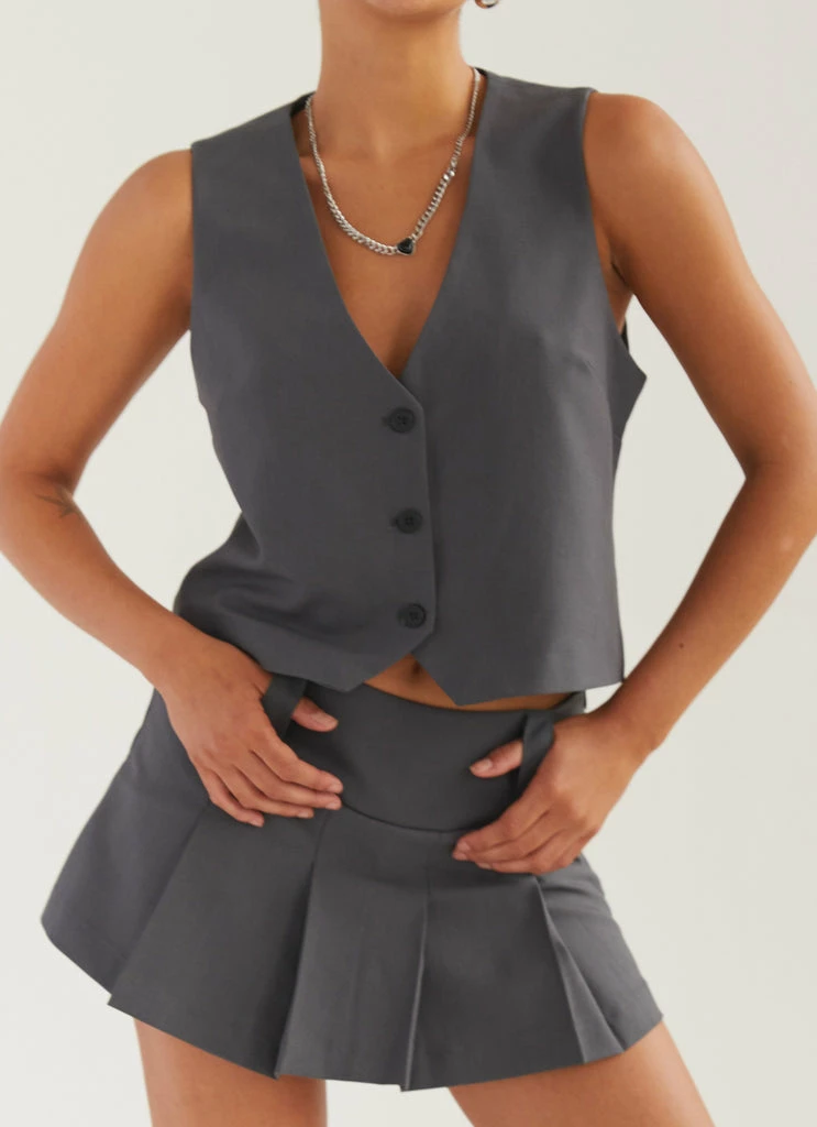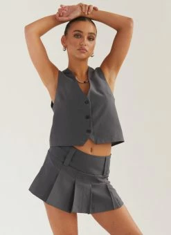 Sexy and sassy in the Dipped In Drama Mini Skirt. This cute ‘lil mini skirt is pleated with a wide fastened waistband. Complete the preppy look and style it back with the Cartwright Vest Top.