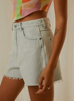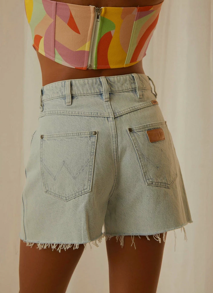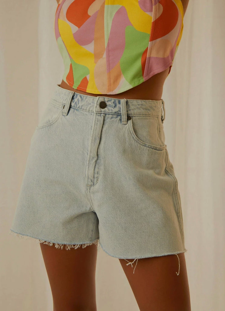 The Hi Bells Short is a high rise short that is fitted through the top block with an a-line short silhouette that creates fuller coverage. Can be worn with the cuff rolled for a cheeky look. Harmony Blues features a perfectly faded light blue denim.High Rise Bells
