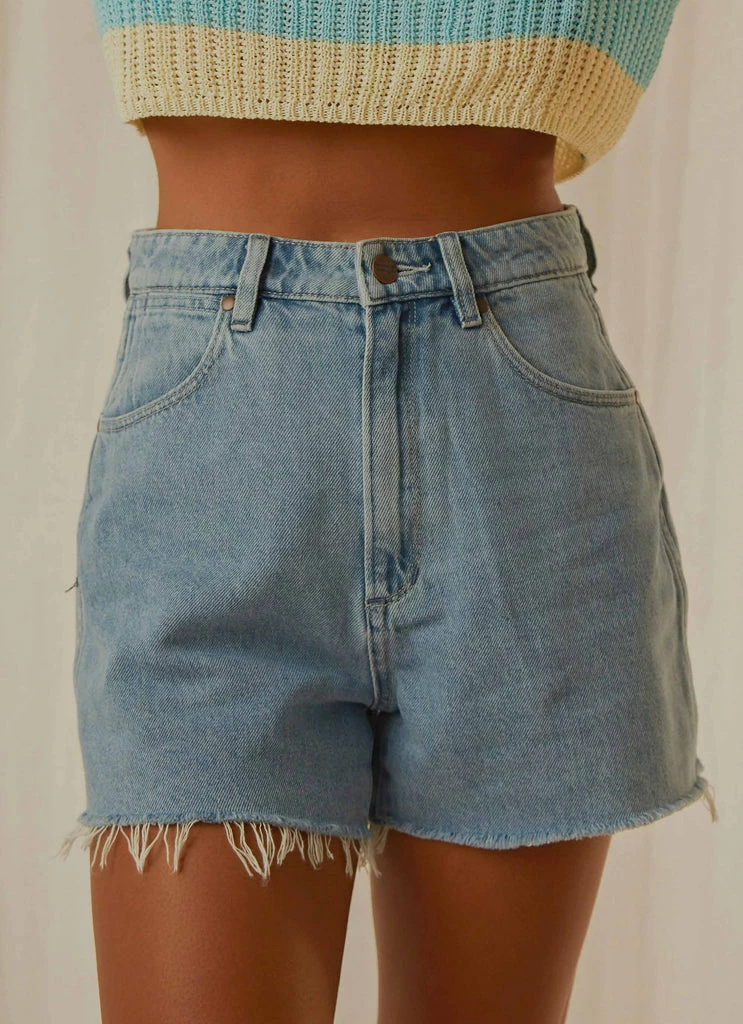The Hi Bells Short is a high rise short that is fitted through the top block with an a-line short silhouette that creates fuller coverage. Can be worn with the cuff rolled for a cheeky look. Hempress is a perfectly faded light indigo denim.